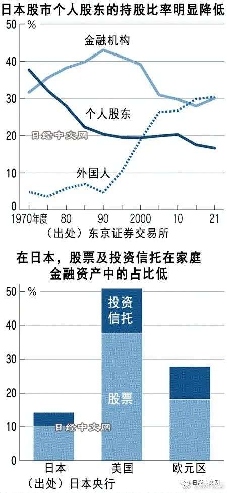 二战后,日本掀起了证券民主化运动,让个人持有之前被财阀和政府掌握的股票。1970年度,日本个人股东的持股比率接近4成。但后来为了保护企业经营权不受外资侵害,企业加快了与银行等的交叉持股。由于泡沫经济崩溃,日本企业的增长希望破灭,2011年度以后个人股东持股比率逐渐下滑,最近一直处于低于两成的水平。
