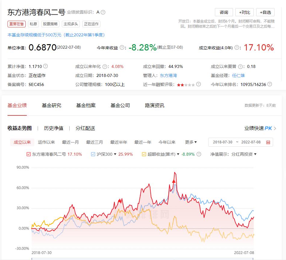 2022年第二季度更新的信息显示,备案于2018年8月13日的东方港湾春风二号私募投资基金存续管理规模低于500万元。 记者查阅私募排排网的数据显示,该产品截至今年7月8日的最新单位净值为0.6870元,累计净值为1.171元,今年以来收益亏损8.28%。从该产品净值曲线来看,从今年5月以来,净值低点是在5月27日,当时的单位净值为0.5920元。之后该产品净值有所回升,其中在6月2日上涨了2.53%,在6月10日上涨了7.08%。6月24日上涨了3.66%。截至7月8日,单位净值回到了0.687元。