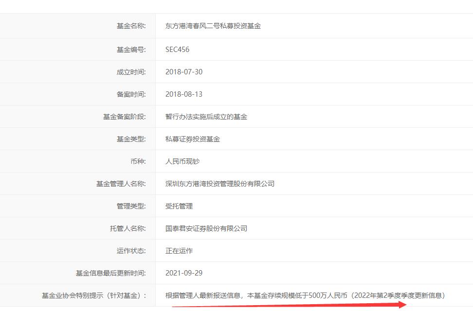 据基金业协会数据显示,但斌东方港湾旗下惊现多只产品管理规模低于500万元。其中包括东方港湾雪中私募证券投资基金、东方港湾春风二号私募投资基金、东方港湾马拉松10号私募证券投资基金、东方港湾马拉松17号私募证券投资基金、中融-东方港湾3号证券投资集合资金信托计划等产品管理规模低于500万元。