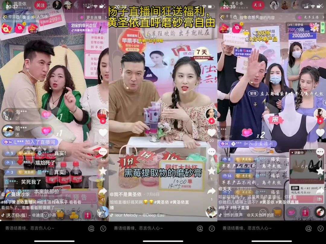 从去年 7 月末开始,黄圣依开始在抖音进行直播,一场直播时长长达 14 小时,成交额超过 5000 万元。可以看到,在当时,黄圣依已经有一些固定的直播模式。首先是自己的才艺展示,比如从浪姐“集训”出来的她可以跳舞。其次则是和杨子一起演绎他们以往共演的段落。最后则是全方位、不间断地“秀恩爱”,强化妻子和母亲的人物特质。