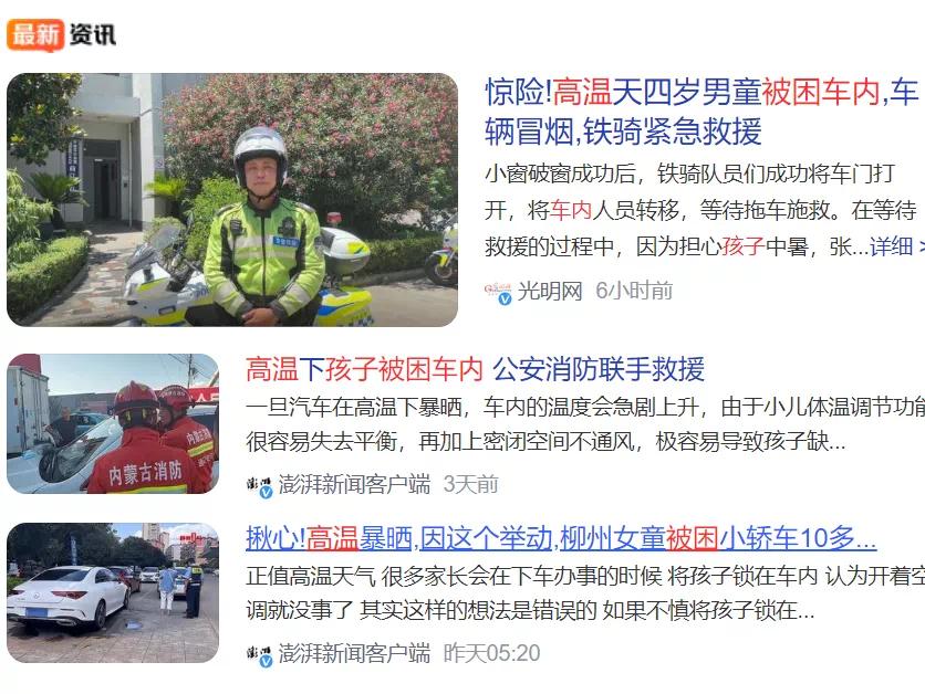有研究显示,阳光照射下车辆仅仅停留 1 小时,座椅温度就达到了 60 度以上,而人体只要体温高于 40 度就有中暑风险,更不要说孩子的体温上升速度远超于成年人。