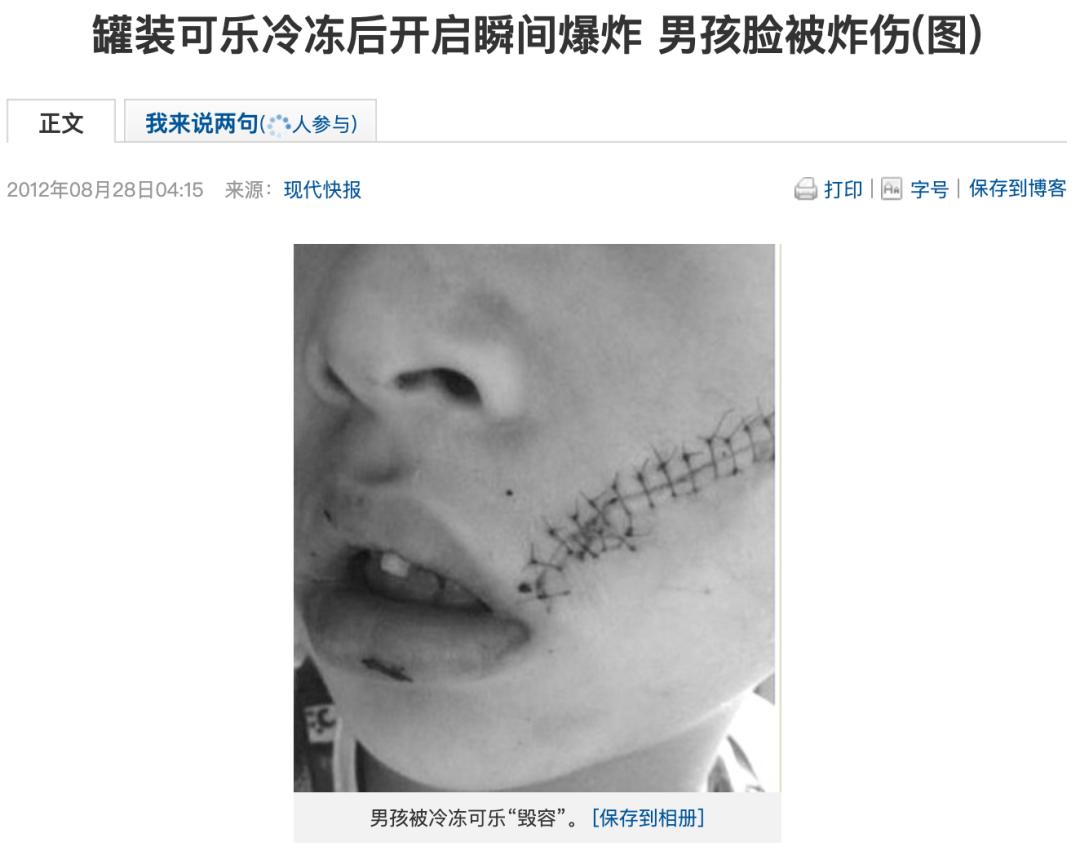 哪怕没有冷冻彻底,开瓶的瞬间,瓶内聚集的二氧化碳压力会让饮料剧烈喷出,压力太大也会造成瓶子爆炸。