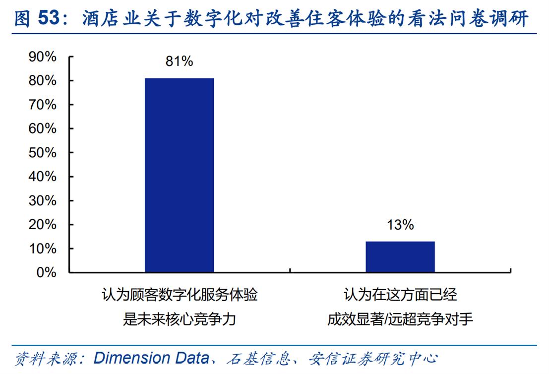 根据DimensionData的调研数据,酒店行业中,认为顾客数字化服务体验将成为未来核心竞争力的经营者占比达81%,但是认为自身在这方面成效卓著或远超竞争对手的经营者占比仅为13%,酒店业数字化转型未来需以顾客体验为导向,不断优化自身通过数字化手段服务顾客的能力。