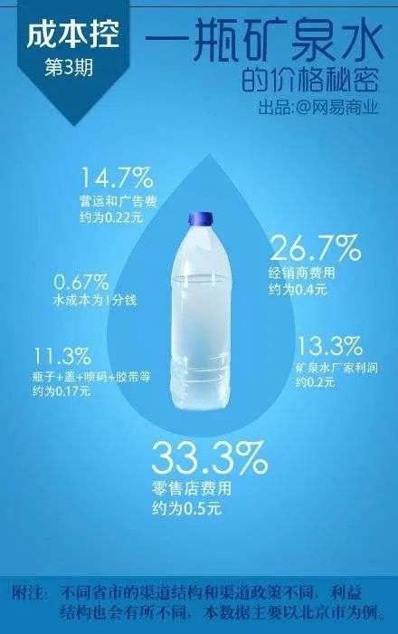 比如一瓶1.5元的矿泉水,生产成本(水和包装成本)只有0.18元,生产商利润只有0.20元,剩下75%都是交易成本,包括商品流通成本(经销和零售费用)0.90元,信息流通成本(广告和运营费用)0.22元。