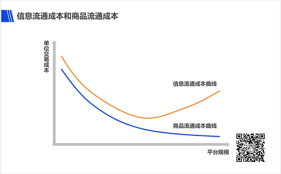 随着信息量的增长,信息流通成本先降低(正规模经济),后提高(负规模经济),而随着商品量的增长,商品流通成本可以持续降低。(其实也存在拐点,只是现实中商品供给量还不足以达到这个拐点)