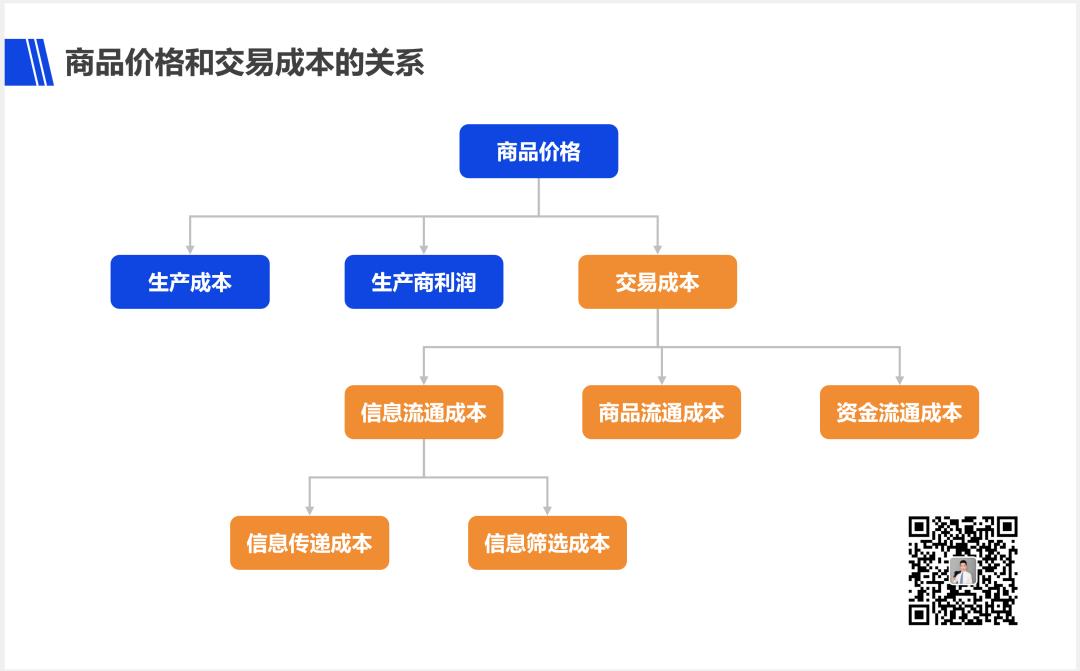 放到实际商业活动中,商品价格包括生产成本、生产商利润和交易成本,交易成本又分为信息流通成本、商品流通成本和资金流通成本。