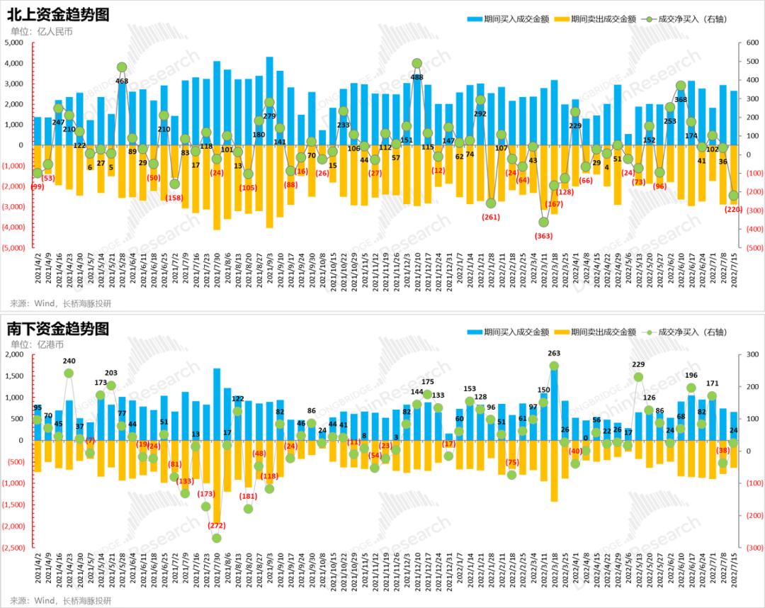 而内地市场也一样,国内市场的修复行情需要外围市场加息预期的稳定,以免美元回流,资金边际减少,对应上周北上资金大幅抽离,单周净卖出幅度仅次于年初国际局势不稳和中概恐慌时期的单周净卖出量。