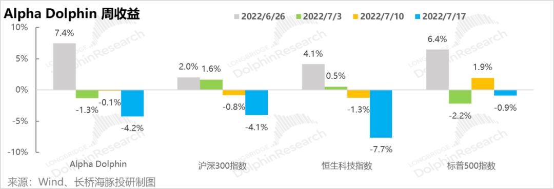 整体中国资产回调幅度较大, 上周(7/11-7/15)海豚投研Alpha Dolphin组合收益单周下跌幅度较大,超过了4%,明显跑输上周标普500指数(下跌0.9%),与沪深300(-4.1%)持平,强于恒生科技-7.7%的表现。