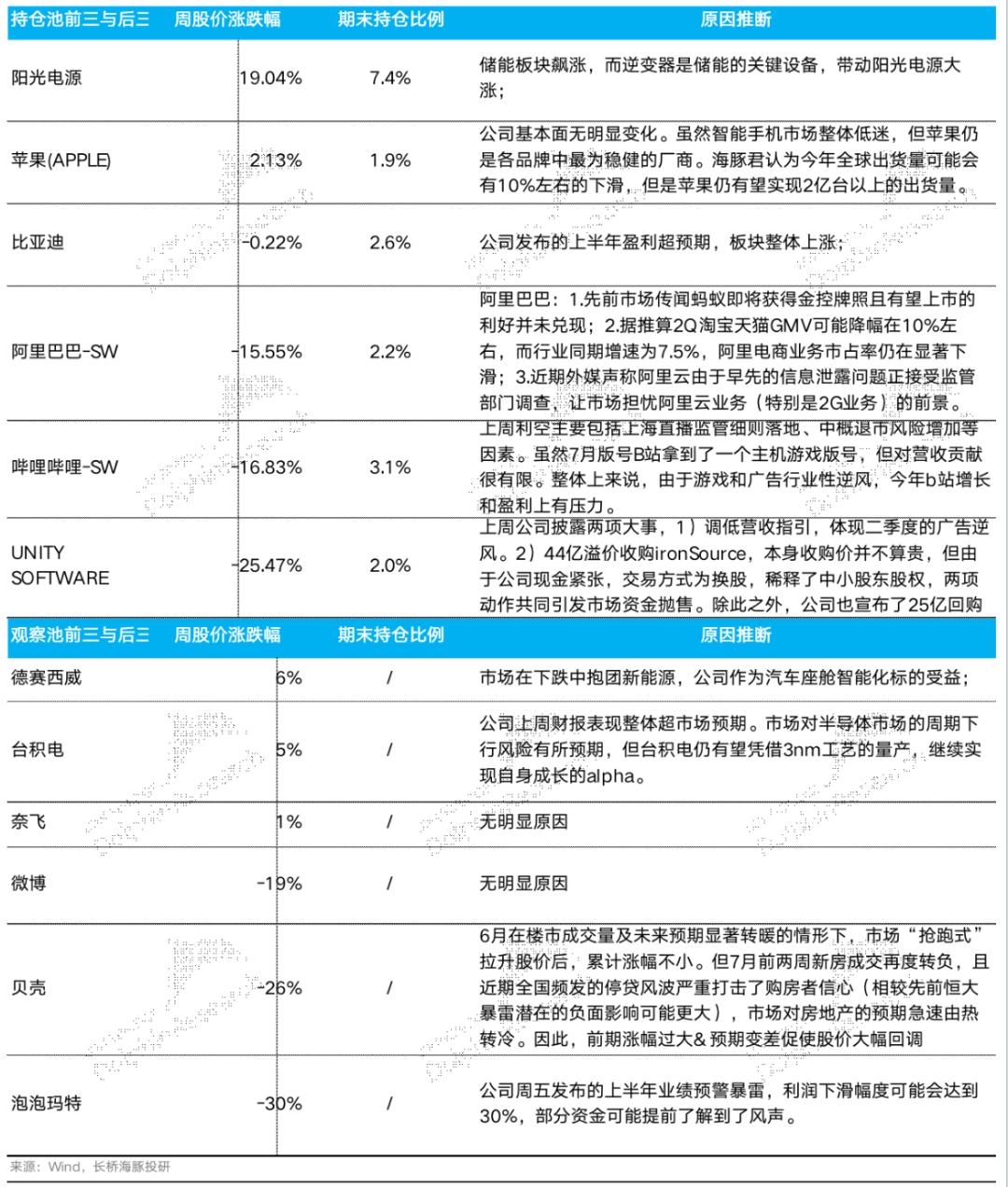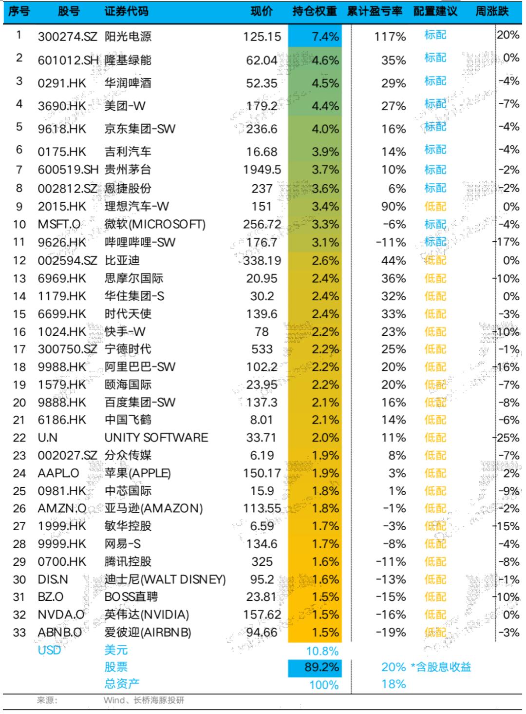 上周在财报季阴影朦胧,加上 退市鬼故事卷土重来 ,中概股由阿里带头,再次大幅回调,消费也不例外,海豚组合中光伏相关的阳光电源和隆基成为唯一镇守的股票。