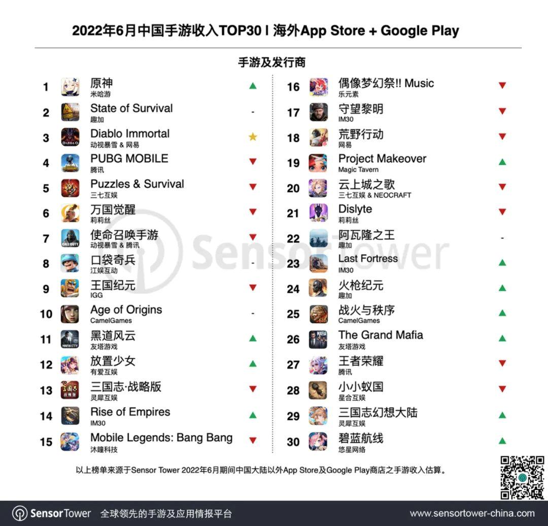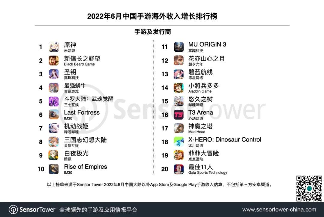 7月18日,Sensor Tower发布了2022年6月中国手游在海外市场的收入及下载量排行榜。