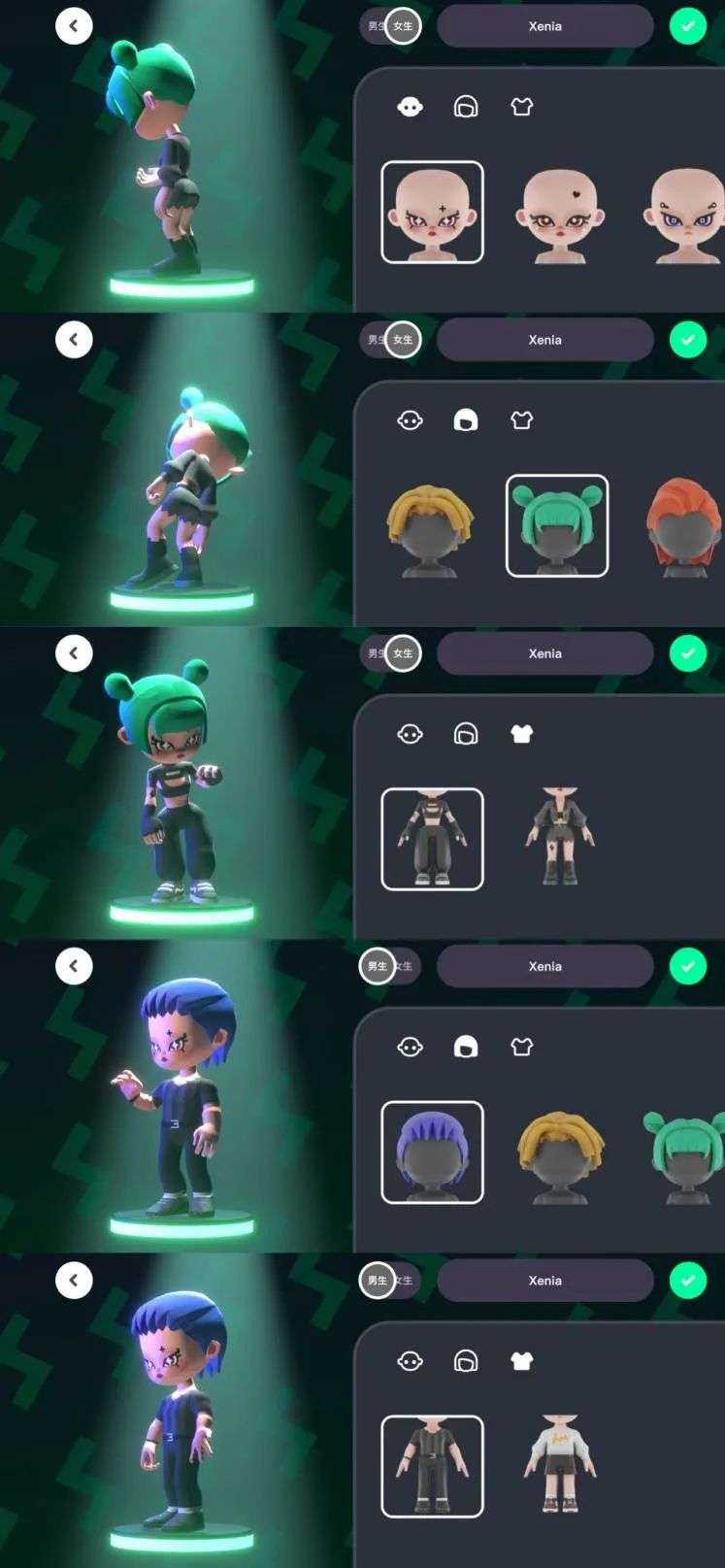Avatar 提供妆容、发型和服装三个选项,4 个妆面都符合传统意义上的夜店妆,明显的美容、形状修饰、亮片;4 种发色分别为紫色、黄色、绿色和橙色均属亮眼彩色;2 套服装走甜酷路线。而且当用户在进行 Avatar 创造时有追光灯打在全身,更是具备氛围。