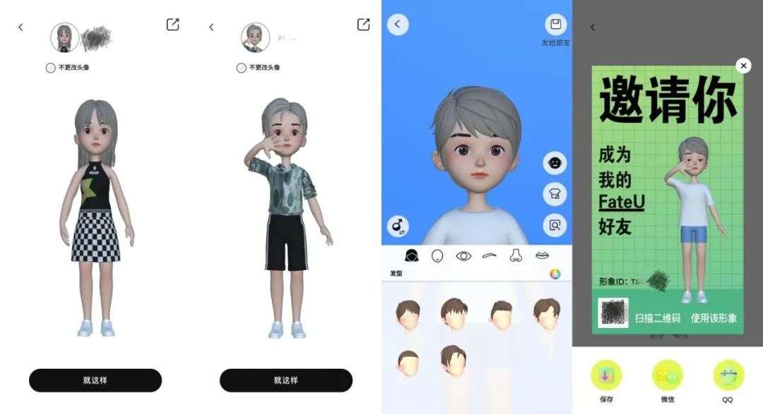 其次,「FateU」鼓励用户“捏脸送人”。用户完全可以像给自己捏脸一样打造一个全新的 Avatar 形象,并赠送给好友,对方只需要扫 Avatar 图片中的二维码就可以直接完成一键换装。除了是一种有趣的交互模式,也是一种不错的增长营销模式。