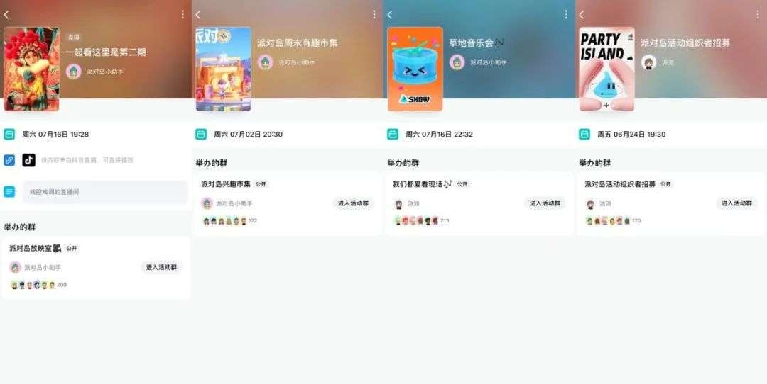 相较于此前社交产品官方社群多用于活动通知、功能介绍和问题解答,「派对岛」官方运营的社群本身就是社交示范。另外,目前「派对岛」也在努力招募活动组织者,希望从创作者侧丰富活动内容,并且创建了派对活动组织者社群,并在群聊场景中滚动循环播放组织者招募 MV。