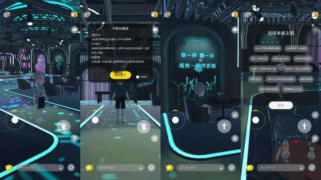 “Club 处 CP”,应用如其名,是一个交友场景。当用户点击进该场景后会自动进入一个房间大厅,房间内一定距离内的用户都可以相互交流。可如果用户想要实现更深入的 1v1 交流,则需要坐在酒桌上并等待另外一个用户坐在对面,坐在同一个酒桌的用户自动结成“对子”。用户坐下之后,可以在标签处标记本桌主题,如#蹲个搞笑女、#想要一个声音好听的小哥哥、#收留心碎小宝贝等,方便提高匹配到自己感兴趣用户的效率。