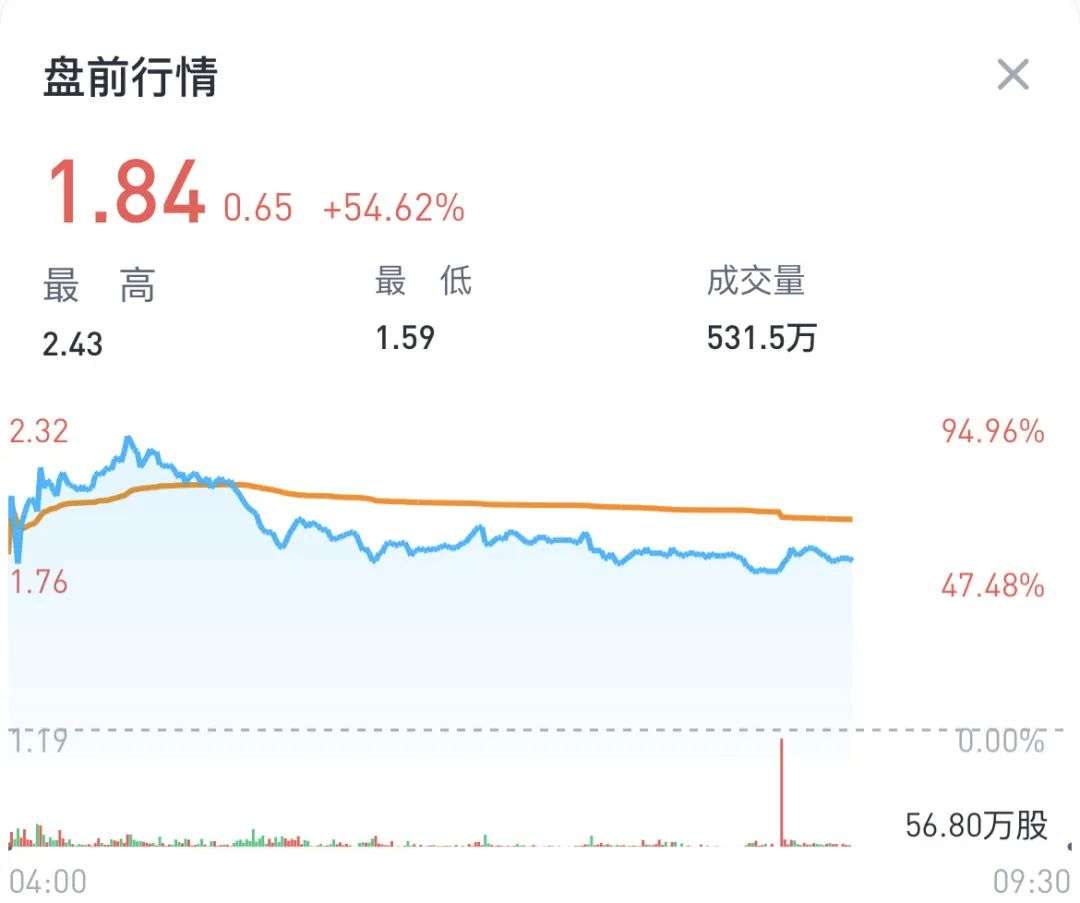 7 月 18 日,趣店盘前暴涨,股价盘中一度从前一日收盘的 1.19 美元翻倍至 2.43 美元。截止发稿,回落至 1.84 美元。