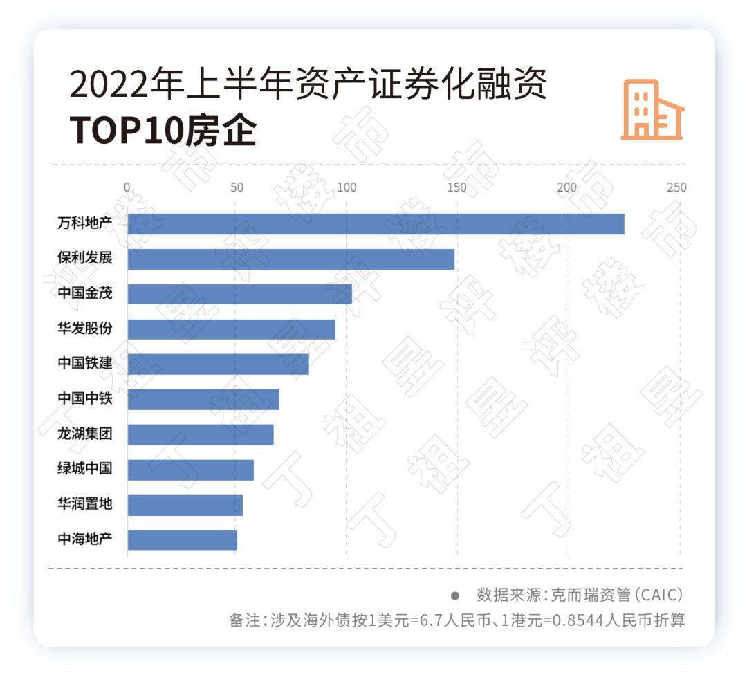 今年上半年,整个资产证券化融资表现比较活跃。CAIC数据显示,上半年房企累计通过资产证券化融资合计规模1398亿,占整个发债总量的超三成。
