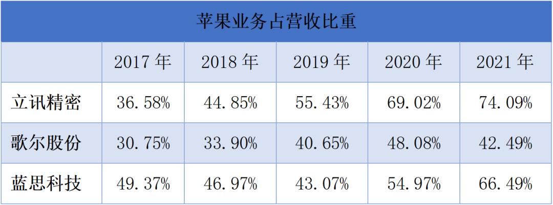 就这样立讯精密苹果业务的销售份额占总营收的比重也从2017年的36.58%一路攀升至2021年的74.09%,可以说立讯精密完全成为为苹果而生的企业。蓝思科技与歌尔股份虽稍显逊色,但苹果业务的销售份额占总营收的比重在2021年也分别达到了66.49%和42.49%。
