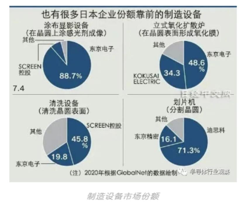 设备方面,GlobalNet指出,仅东京电子在涂布显影设备上的份额就占到近9成,是世界唯一的量产企业。在清除晶圆垃圾及污物的清洗设备上,日本企业的份额超过6成。后制程设备的划片机方面,DISCO拥有7成份额。