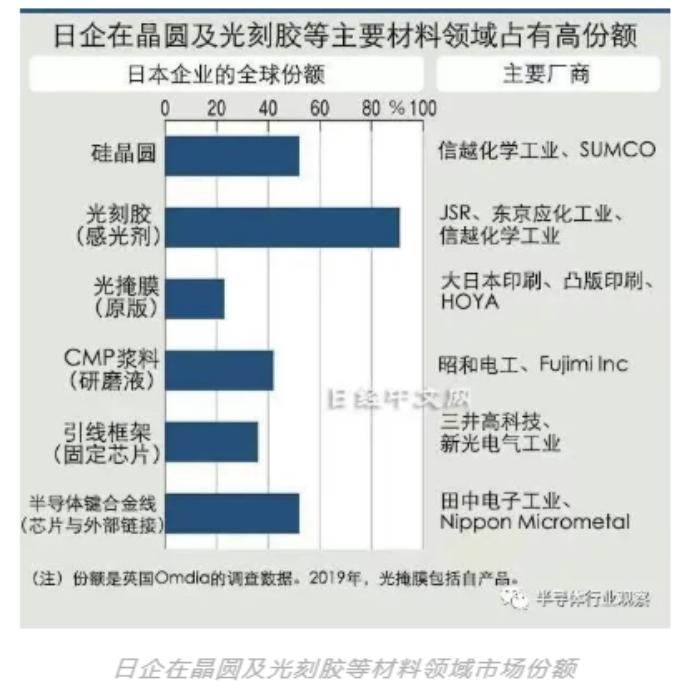 日经中文网数据显示,在作为半导体基板的硅晶圆领域,信越化学和SUMCO两家日本企业占有全球5成以上的份额;在集成电路生产不可或缺的光刻胶部分,JSR及信越化学在内的日本企业所占份额达到9成。昭和电工等企业发力的半导体表面研磨用的CMP研磨液,仅日本企业所占的份额就超过4成。
