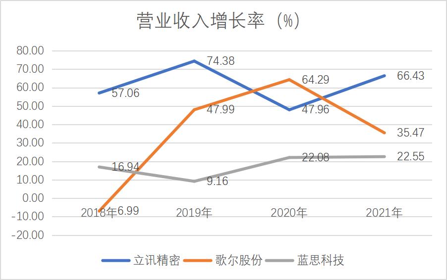 曾经,成为苹果供应商是中国电子厂梦寐以求的事情,所谓大树底下好乘凉,加入果链之后,意味着业绩的稳定增长,这主要反映在营收增长率上,2018年以来立讯精密、歌尔股份和蓝思科技三家的营收增长率均保持了较快的增长,其中立讯精密保持了50%以上的增长率,最差的蓝思科技也保持了20%以上的增长率。