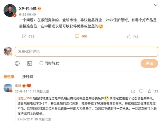 一位微博名为“理想_ONE”的网友这样回答“短期的精准定位是中长期获得优势或者壁垒的必要条件······能够持续精准定位本身也是一种能力和壁垒了。”然后李想转用这条评论,用一个爱心表情在何小鹏的这一条微博下发表了评论。