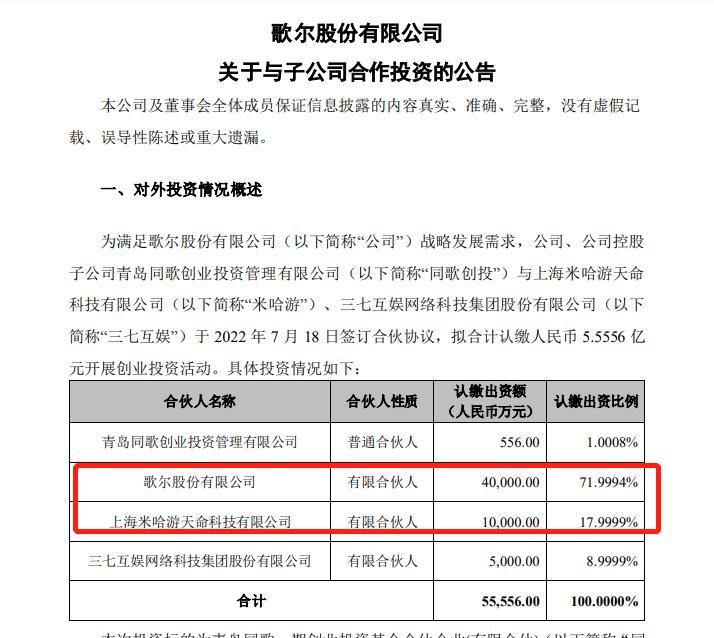 7月18日,歌尔股份发布公告,歌尔股份与米哈游、三七互娱签订合伙协议,拟合计认缴人民币5.56亿元开展创业投资活动。其中,米哈游出资1亿元,认缴该合伙企业的17.99%股份。