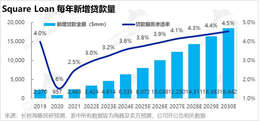 测算Square Loan的营收可拆分为,Square Loan收入 = 商户总支付额(GPV) * 贷款渗透率 * 渠道费用率(or息差)的逻辑进行预测。
