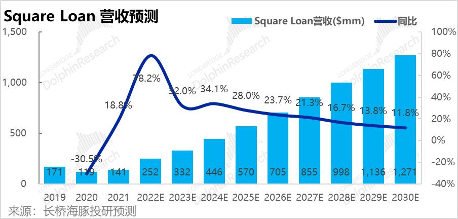 基于以上假设,我们预测Square Loan的营收可由2021年的1.4亿增长到30年的12.7亿,可见增长弹性相当大。