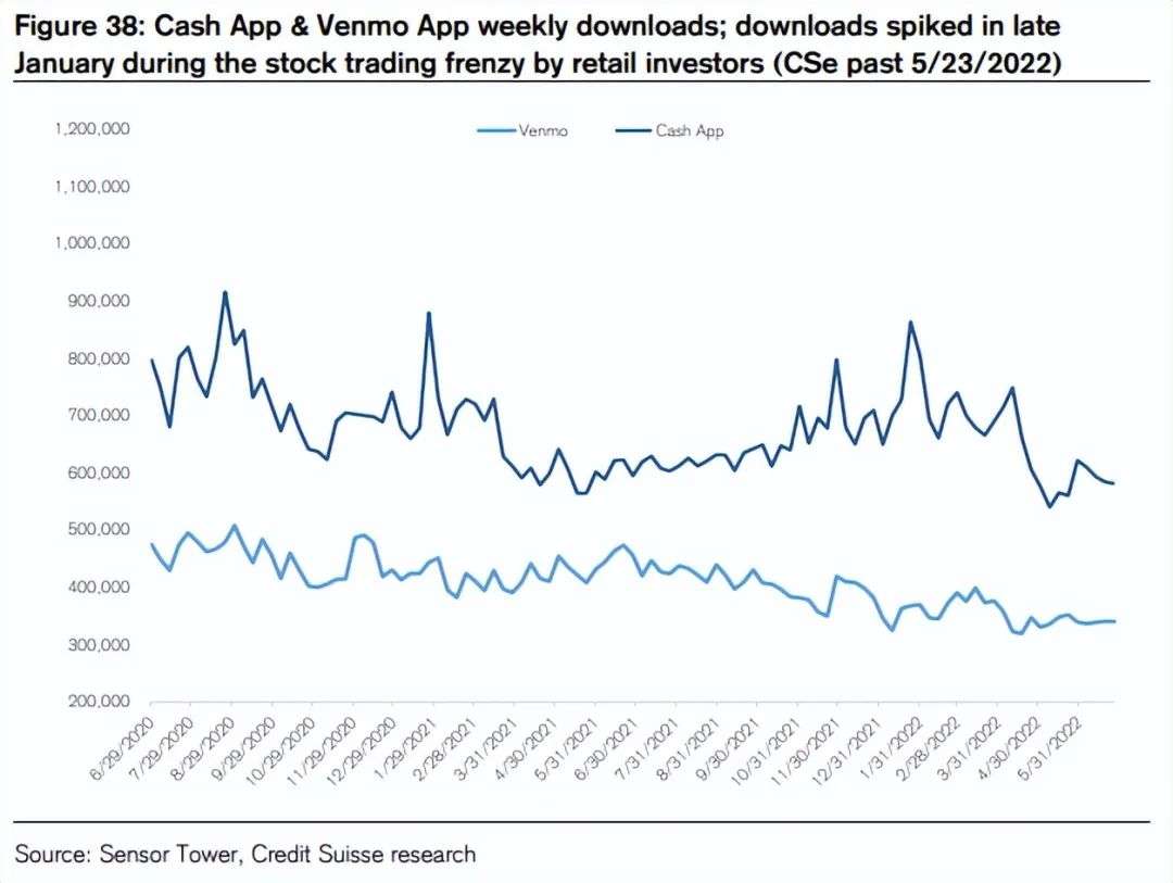 从增长速度来看,自2020年以来Cash App的增长势头一直高于Venmo(下图中Cash App的下载量显著更高);并且Cash App更多的金融性功能,也使其在支付之外拥有更多的变现渠道和潜力,因此海豚君认为Cash App很有可能在美国数字钱包的混战中胜出。
