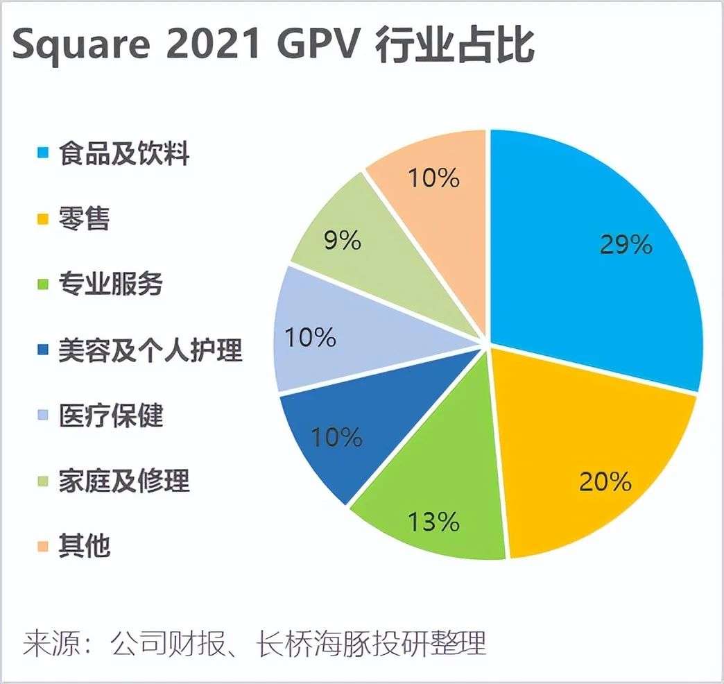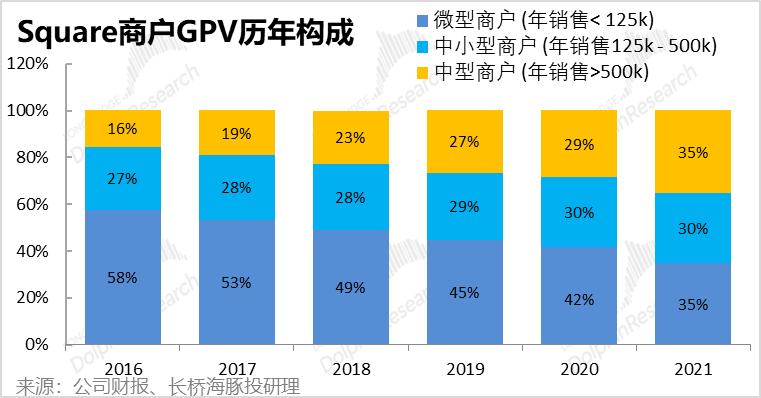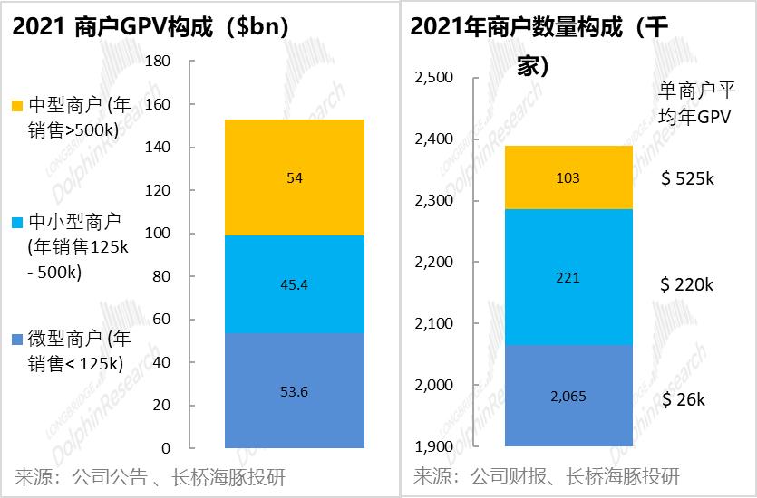 那么经计算,2021年Square的活跃商数户约在240万左右。其中,微型商家约有200万,中小型商户约22万,中型商商户则有约10万,分别占全美对应规模商家总数的约13%,和6%。