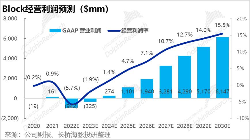 结合我们先前对营收及毛利的预测,以及三费在近期会显著膨胀。海豚君预计Block的经营利润在2022-23年间会有明显亏损,但到2024年会重新转正。且到2030年经营利润率有望达到15.5%