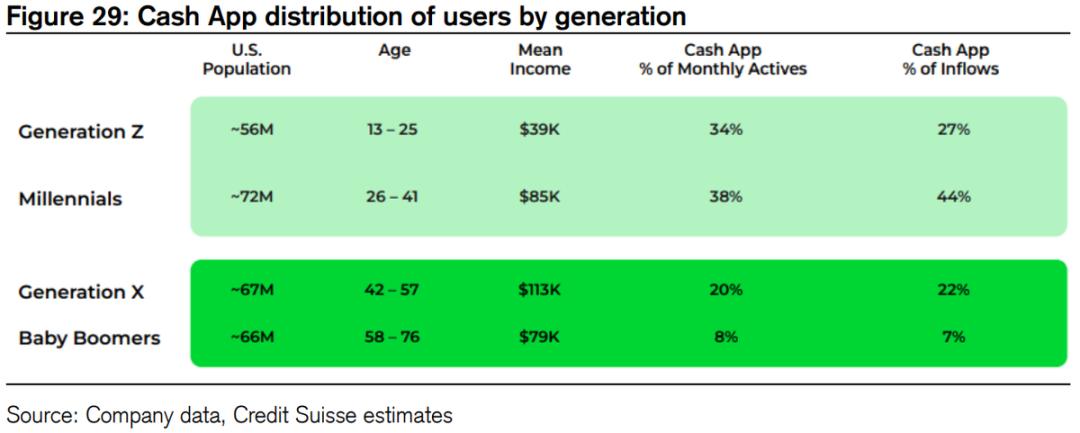 根据公司在2022年Investor上的披露,Cash App 4400万的月活用户中,72%来自于13-41岁的Z世代和千禧世代,其他来自更年长的X世代和Baby Boomer。结合美国当前的人口数据,换算可得Cash App在Z&千禧世代中的渗透率已在24%,而在X世代也有14%的渗透率。