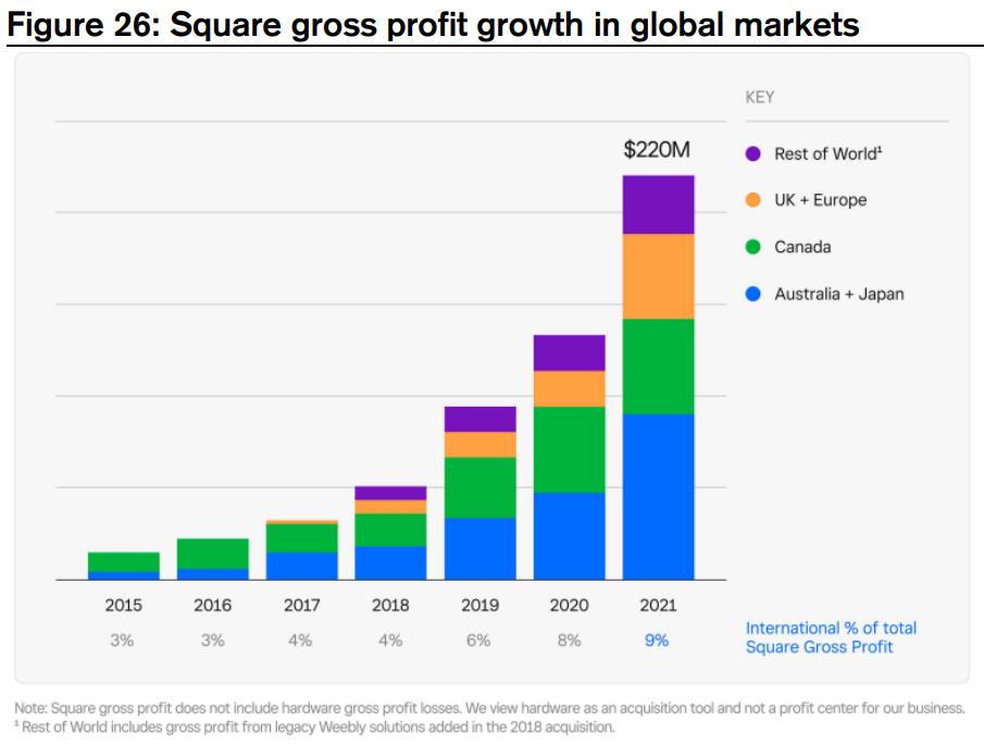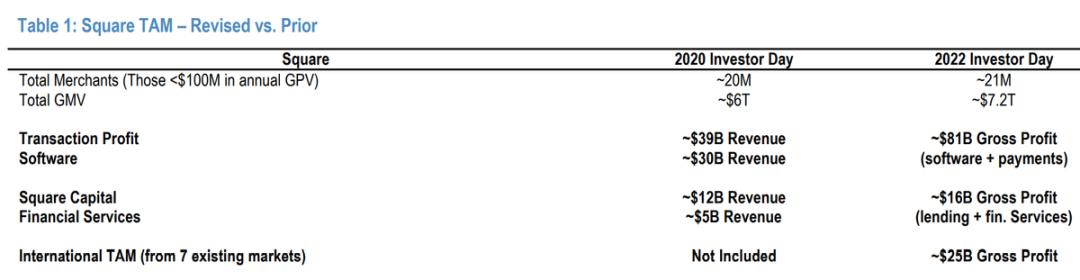 而根据公司最近在2022 Investor Day上披露的信息,Square在美国外其他7国的潜在市场规模为250亿美元(毛利率口径),相当于美国的1/3。
