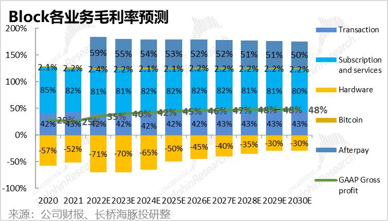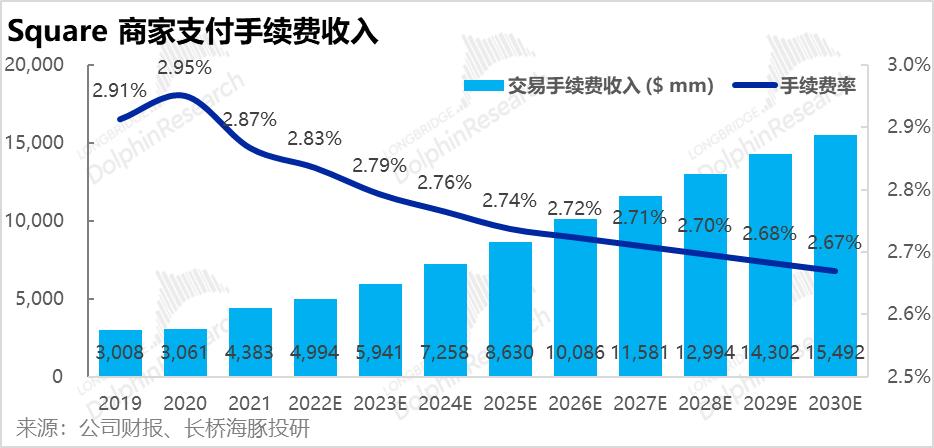 基于上述逻辑,我们预计支付手续费率会从2021的2.87%,下降缓慢下降到2030年2.67%。再乘以30年$580bn GPV,可推算出2030年Square支付手续费收入可达约154亿美元。
