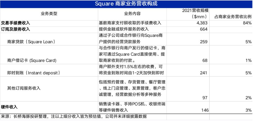 因此,基于硬件销售带来的用户基本盘,Square商家业务的主要营收实际是来自支付手续费(一般为支付额的2.6%-3.5%),以及面向商家提供的各类订阅和服务收入,主要包括: