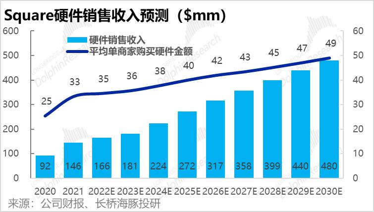 因此,我们预计硬件销售收入的增速也会高于商家增速,详细来说,我们预计硬件销售收入将由2021年的1.5亿增长到30年的4.8亿。