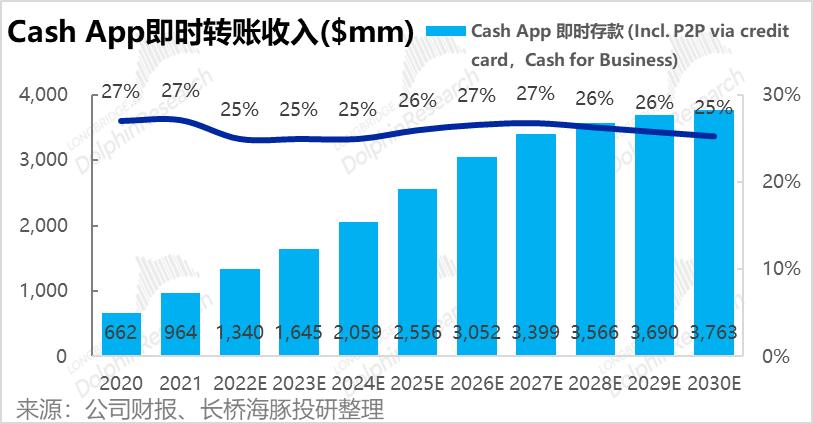 基于以上假设,我们预测Cash App即时存款收入有望由2021年的9.6亿美元增长到2030年的38亿美元。