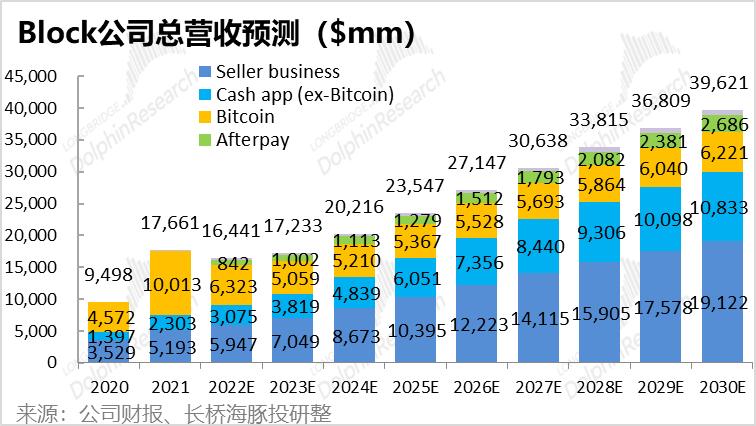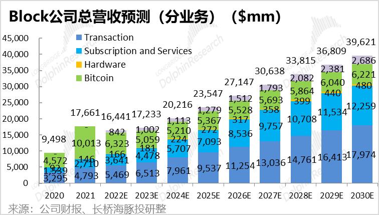 我们假设到2030年Cash App Pay的人均年支付金额提升到$940(据海豚君推算占美国人均消费额的3%),那么Cash App的营收有望在2030年达到近25亿美元。