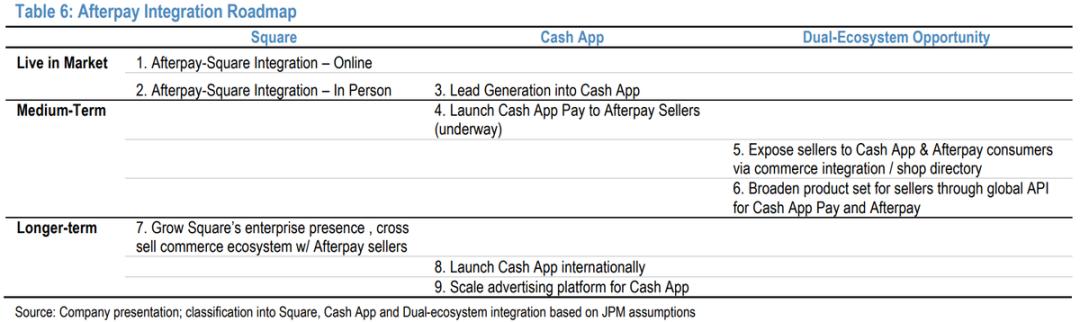 下表展示了,公司给出的短、中、长期融合计划。在C端,通过把AfterPay分期购物功能整合进Cash App内,弥补Cash App内缺乏线上购物&支付场景的缺陷,同时也能向AfterPay商户推广公司的Cash App Pay支付功能。而在B端,公司一是可向Square现有商家提供先买后付功能,二者也能向AfterPay商户推广Square的其他服务。