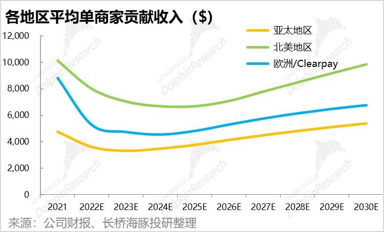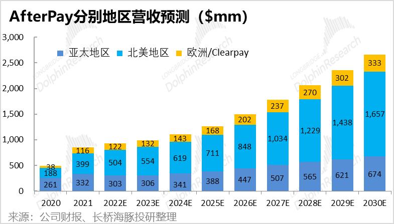 基于以上假设,海豚君估算AfterPay的总营收有望从2021年的8.5亿增长到2030年的26.6亿,其中12.5亿的增长由北美地区贡献。