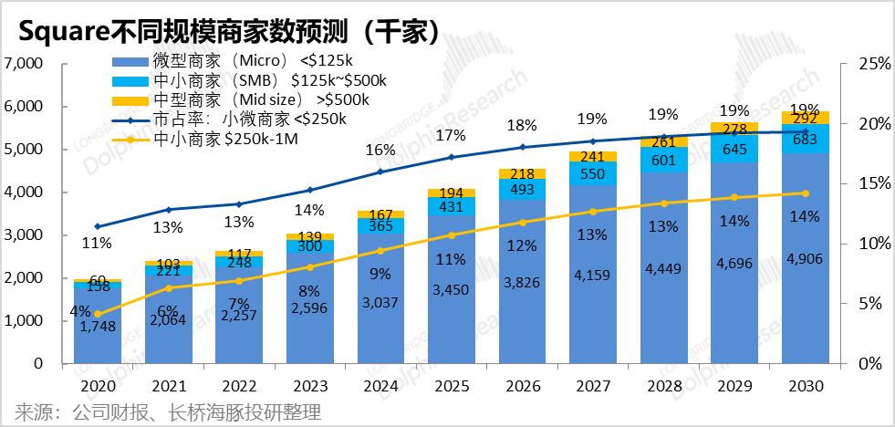 那么结合上文全美商家总数,海豚君预计到2030年,Square在年销售<$250k商家中的市占率由13%提升到19%;而年销售在$250k-$1m的商家中的市占率由6%提升到14%。因此,Square的商户规模将由2021年的约240万,增长到2030年的约580万。