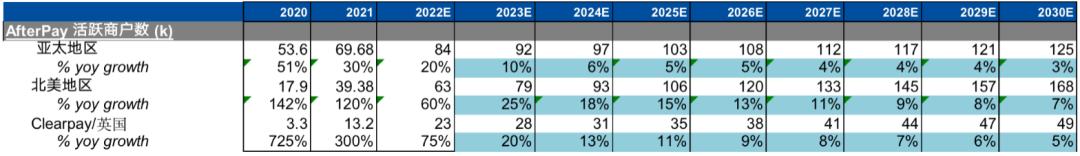 那么就AfterPay的营收预测,其营收渠道因素可拆分为 AfterPay收入 = 商家数量 * 单商家GMV * 公司take rate。由Block在北美拥有的丰富商家资源有助提升AfterPay的使用场景,我们预计AfterPay在北美能取得最快的增长。在英国和欧洲的增速相对低于美国;而在澳洲大本营因为业务已相当成熟,且地区经济增长潜力低于欧美,因此预计亚太地区的增速最低。详细预测如下。
