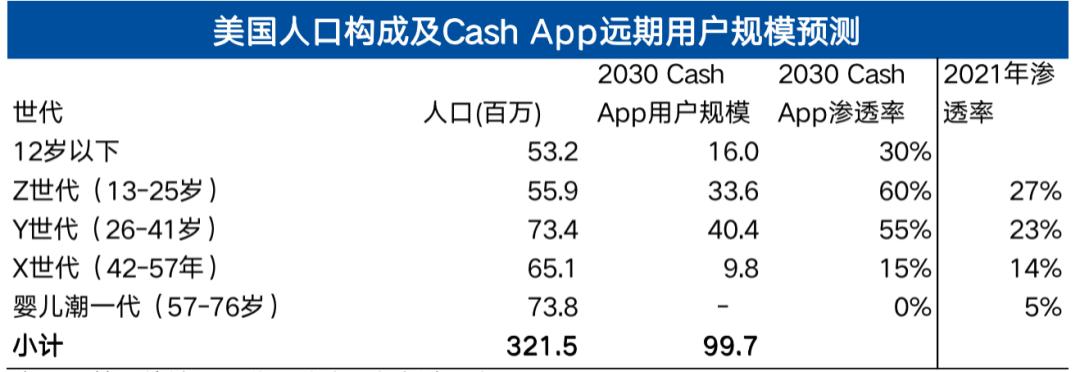 那么展望未来,我们假设到2030年Cash App在美国壮年人口(Z世代&千禧)的渗透率提升到55%-60%,假设当前12岁以下人口的渗透率到2030年对标当前Z世代提升到30%,而X世代&Baby Boomer则由于年纪增长,预计渗透率下滑。