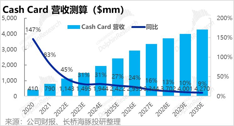 基于以上关键假设,在用户量、渗透率、人均使用金额三个因素都由提升空间的驱动下,我们预测Cash Card的营收有望从2021年不到8亿美元,增长到2030年的43亿美元。