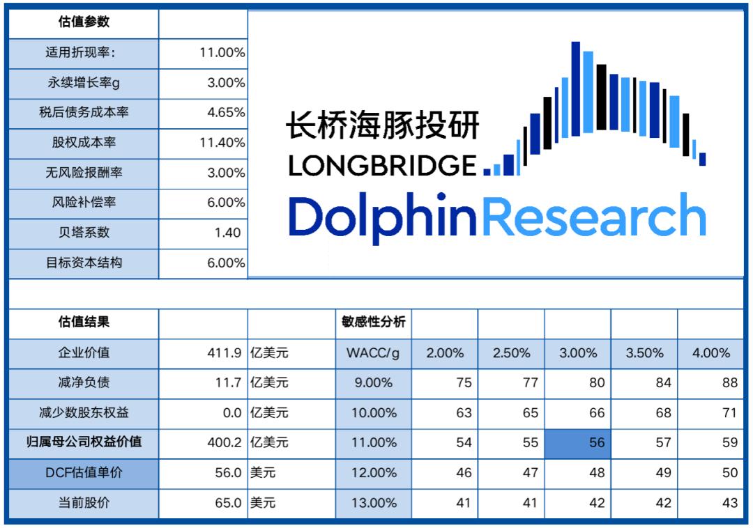 海豚君基于以上中性的业绩预测,落地到估值上,考虑到后面它会增加营销开支,进入到新的投入期,去拓展新业务,海豚君以2024年扭亏之后的利润为起点来做现金流折现,按照3%的永续增长率和11%的折现率,对应单股价值56美元,相比65美元的股价,还有大约15%的折价空间。