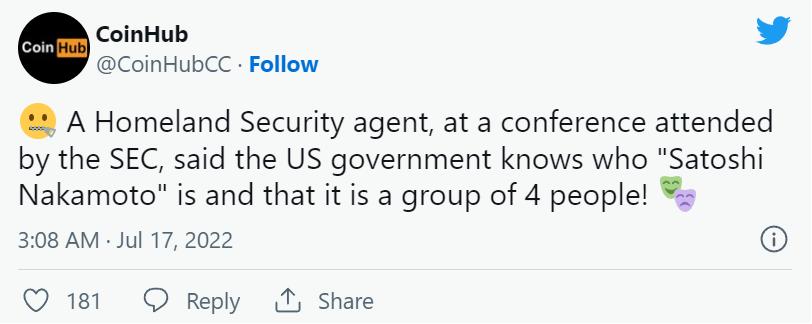 美国时间7月17日,一条劲爆消息引起了热议,CoinHub官方推特发文,一位美国国土安全部成员在参加美国证券交易委员会(SEC)的会议时表示,美国政府知道谁是中本聪,他们是一个四人团体。
