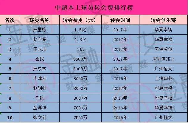 ▲ 中超本土球员转会费排行榜/金融八卦女制图