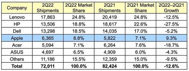 Gartner方面表示,2022年第二季度,全球PC市场前三大供应商排名保持不变,但出货量出现下降。其中,惠普下跌27.5%,戴尔下跌5.2%,排名第一的联想下降了12.5%。苹果是唯一一家在2022年第二季度实现增长的供应商,Gartner研究副总裁蔡惠芬向《IT时报》记者表示,原因在于苹果推出的M1芯片产品受到市场欢迎,吸引换机的需求。