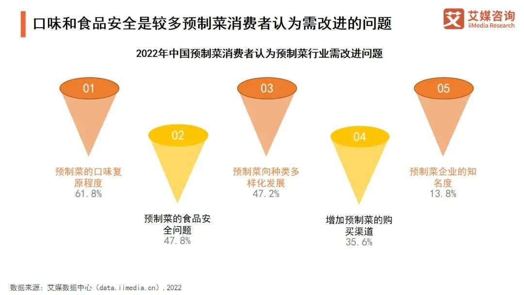 《2022年中国预制菜行业发展趋势研究报告》显示,61.8%的消费者认为预制菜的口味复原程度需要改进,47.8%的消费者认为预制菜的食安问题需要改进。在消费者认为预制菜行业需要改进的问题中,排在第一位的是口味复原程度。