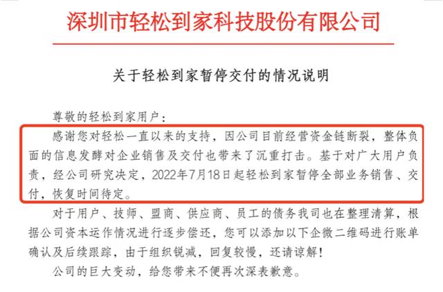 7月17日深夜,轻松到家官方微博突然发布声明称,因公司经营资金链断裂,且负面信息持续发酵对企业销售带来了沉重打击,基于对广大用户负责,经公司研究决定,2022年7月18日起轻松到家暂停全部业务销售、交付,恢复时间待定。